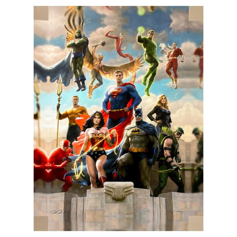 "The Justice League: Classic Variant" is a limited edition giclee on canvas from DC Comics and Paolo Rivera, PP numbered 3/4 and bearing the authorized signature of the artist. Includes Letter of Authenticity. Measures approx. 25" x 18" (image).