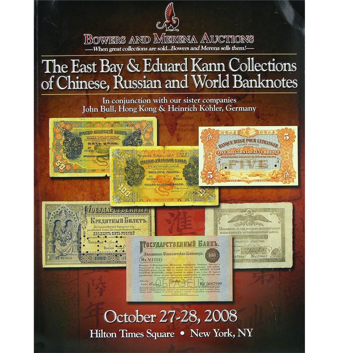Bowers and Merena Auctions. THE EAST BAY & EDUARD KANN COLLECTIONS OF CHINESE, RUSSIAN AND WORLD BANKNOTES. New York, Oct. 27-28, 2008. 4to, original pictorial card covers. xii, (2), 353, (1) pages; illustrated in color. Corner bump; near fine. An important catalogue.