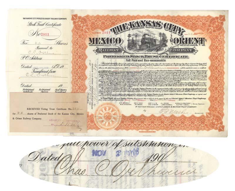 1906, Kansas. Stock certificate for forty five shares. Orange / Black. Vignette of a locomotive at top center. Issued to “C.C. Orthwein,” and signed on verso by CHARLES CLEMMENS ORTHWEIN (1869 - ? ) American businessman. Perforation cancellations do not affect Orthwein’s signature. Charles C. Orthwein was a partner in the grain exporting firm of C.F. Orthwein & Sons, which principally focused on the exporting of grain via the Gulf of Mexico. Conceived in 1900 by A.E. Stilwell, the Kansas City, Mexico and Orient Railway was the predecessor to the Chihuahua al Pacifico railroad in Mexico. In the wake of a 1912 bankruptcy, the AT & SF acquired the line in 1928, largely in order to gain access to the west Texas old fields.