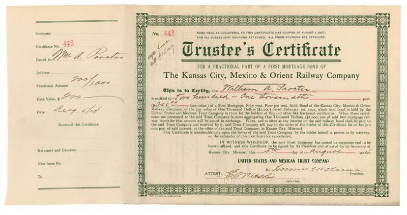 1906, Kansas. Stock certificate for one hundred and eight shares. Orange / Black. Vignette of a train at top center. Issued to WILLIAM A. PROCTOR. Son of Proctor and Gamble’s co-founder, William Proctor. Signed on verso by WILLIAM C. PROCTOR (1862-1934) Manufacturer and philanthropist. The grandson of Proctor and Gamble’s co-founder, William Cooper Proctor changed the manner of distribution and marketing of the company products, creating one of the largest corporations in the country. Perforation cancellation do not affect W.C. Proctor’s signature. Conceived in 1900 by A.E. Stilwell, the Kansas City, Mexico and Orient Railway was the predecessor to the Chihuahua al Pacifico railroad in Mexico. In the wake of a 1912 bankruptcy, the AT & SF acquired the line in 1928, largely in order to gain access to the west Texas old fields.