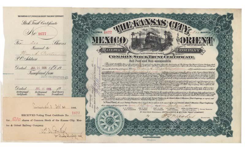 1906, Kansas. Stock certificate for two hundred shares. Green / Black. Vignette of a train at top center. Issued to WILLIAM A. PROCTOR. Son of Proctor and Gamble’s co-founder, William Proctor. Signed on verso by WILLIAM C. PROCTOR (1862-1934) Manufacturer and philanthropist. The grandson of Proctor and Gamble’s co-founder, William Cooper Proctor changed the manner of distribution and marketing of the company products, creating one of the largest corporations in the country. Perforation cancellation do not affect W.C. Proctor’s signature. Conceived in 1900 by A.E. Stilwell, the Kansas City, Mexico and Orient Railway was the predecessor to the Chihuahua al Pacifico railroad in Mexico. In the wake of a 1912 bankruptcy, the AT & SF acquired the line in 1928, largely in order to gain access to the west Texas old fields.