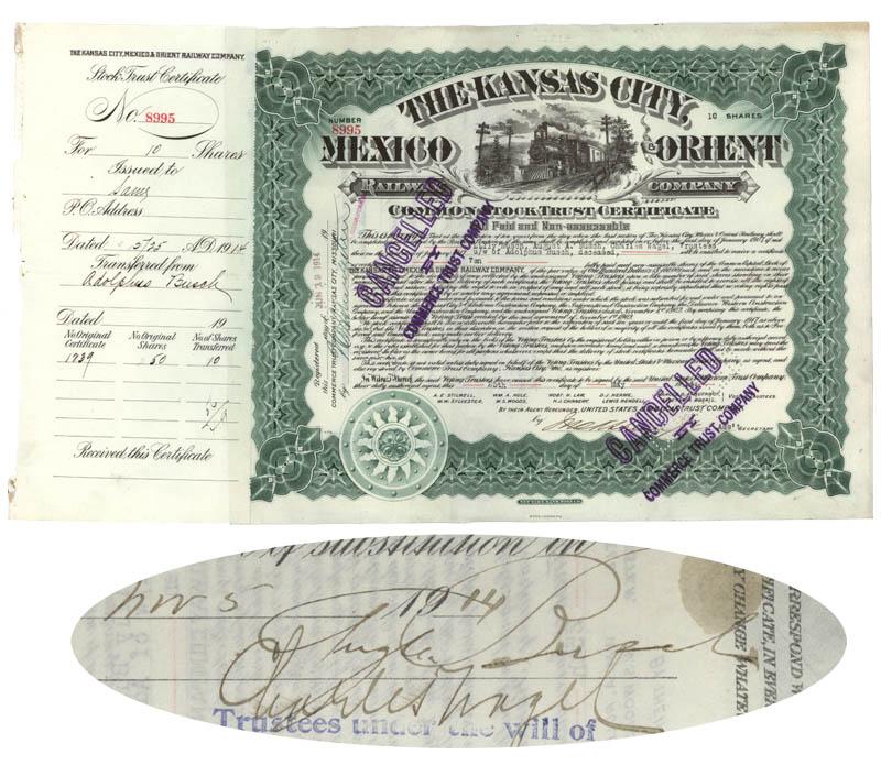 1914, Kansas. Stock certificate for twelve shares. Orange / Black. Vignette of a locomotive at top center. Issued to “Lily Busch, August A. Busch and Charles Negel, trustees, U/w of Adolphus Busch, deceased,” and signed on verso by AUGUST ANHEUSER BUSCH, SR. (1865-1934). Brewing magnate who served as president and CEO of Anheuser-Busch from 1913-1934. Perforation and stamp cancellations do not affect August Busch’s signature. Conceived in 1900 by A.E. Stilwell, the Kansas City, Mexico and Orient Railway was the predecessor to the Chihuahua al Pacifico railroad in Mexico. In the wake of a 1912 bankruptcy, the AT & SF acquired the line in 1928, largely in order to gain access to the west Texas old fields.