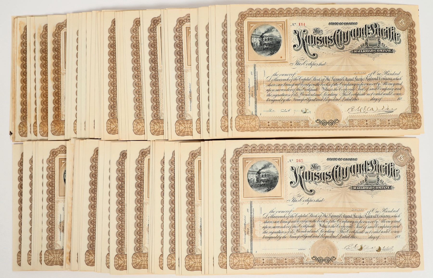 100 plus. 24 are I/C. The remainder are unissued, but signed. All have the receipts attached. The Kansas City and Pacific Railroad Co., VG or better.