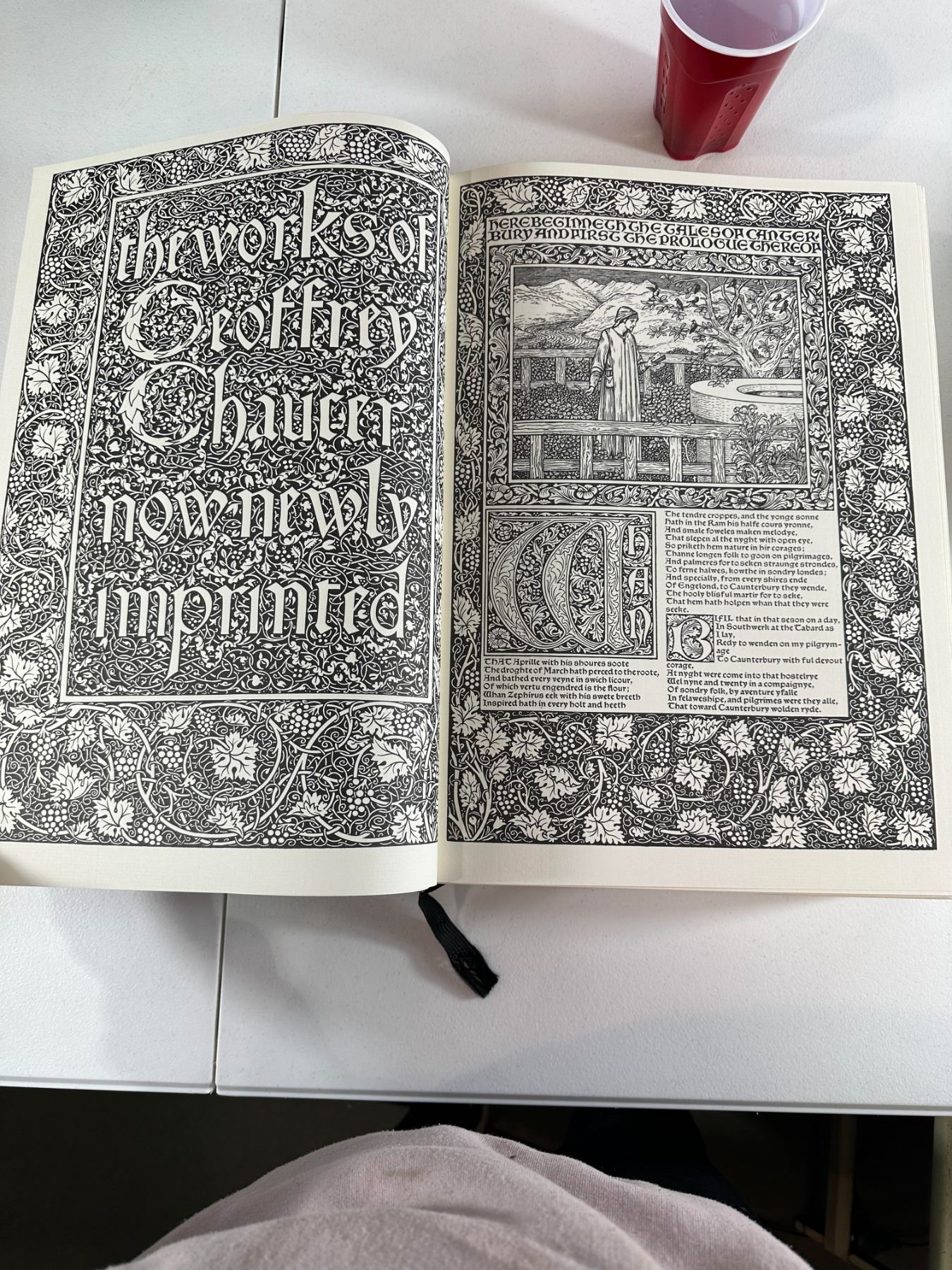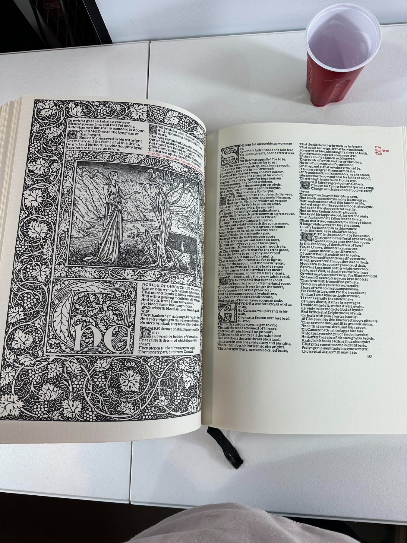 Folio Society facsimile of William Morris’s 1896 Kelmscott Press Chaucer - Decorative gilt-covered binding; housed in matching slipcase - Publisher: The Folio Society, London; high‑quality reproduction - Era: late 20th century - Condition: excellent overall; minor slipcase wear 17"H x 12"W
