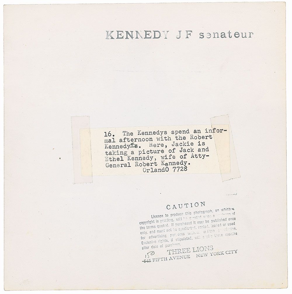 Original first-generation 7.5 x 7.75 glossy photo of Jackie taking a photo of Bobby and Ethel Kennedy as they sit outside. Reverse of photo bears a Three Lions Inc. stamp and an affixed typed caption which reads, “The Kennedys spend an informal afternoon with the Robert Kennedys.” In fine condition. Photo rights: The Lowenherz Collection of Kennedy Photographs, Friedheim Library and Archives, the Peabody Institute of The Johns Hopkins University, Orlando Suero, photographer.