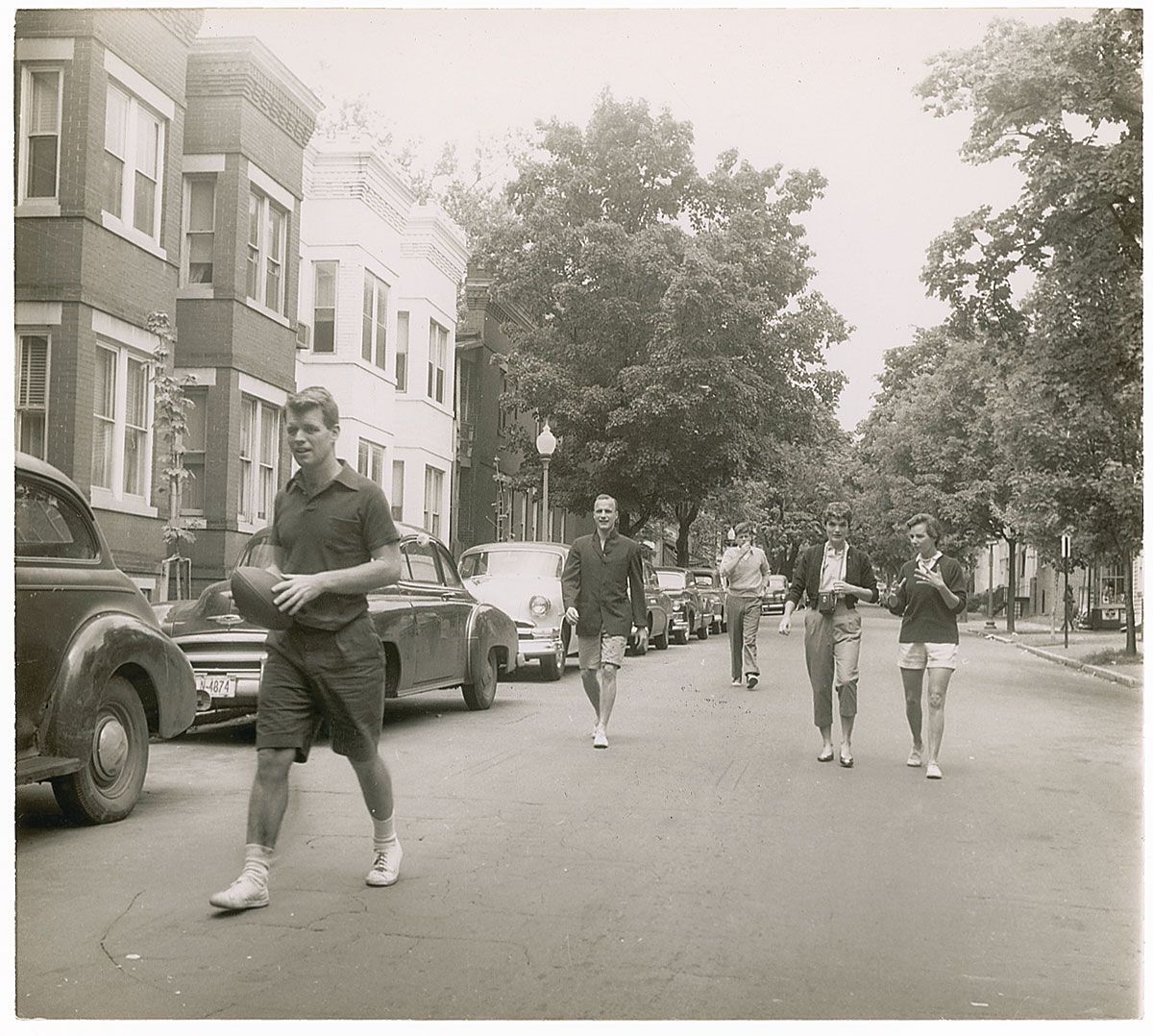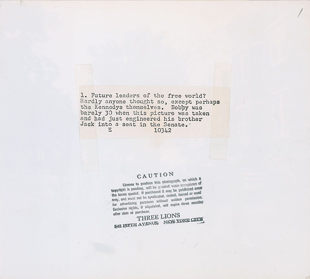 Original first-generation 9 x 8 glossy photo of John, Robert, Jackie, and Ethel Kennedy walking down a street in Georgetown, with Bobby holding a football, as the group heads to a nearby park. Reverse of photo bears a Three Lions Inc. stamp and an affixed typed caption. In fine condition. Photo rights: The Lowenherz Collection of Kennedy Photographs, Friedheim Library and Archives, the Peabody Institute of The Johns Hopkins University, Orlando Suero, photographer.