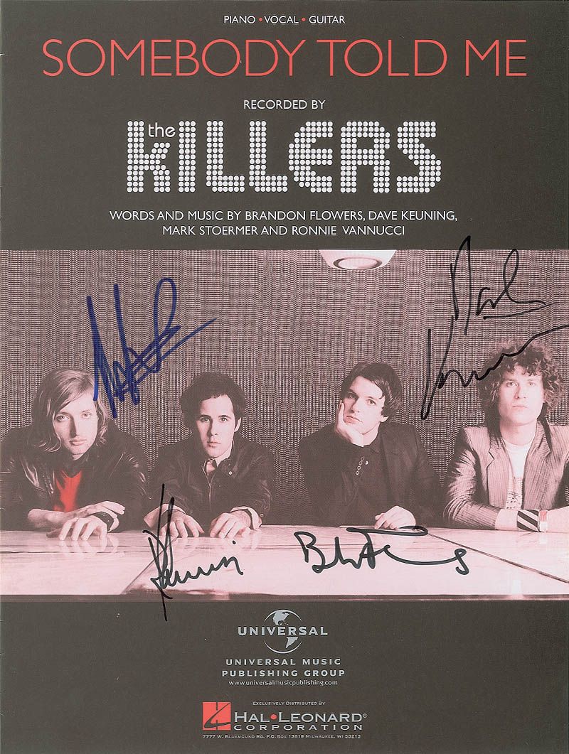 Sheet music to ‘Somebody Told Me,’ 9 x 12, seven pages, signed on the front cover in blue and black felt tip by Brandon Flowers, Dave Keuning, Mark Stoermer, and Ronnie Vannucci. In fine condition, with a mild crease to lower right corner.