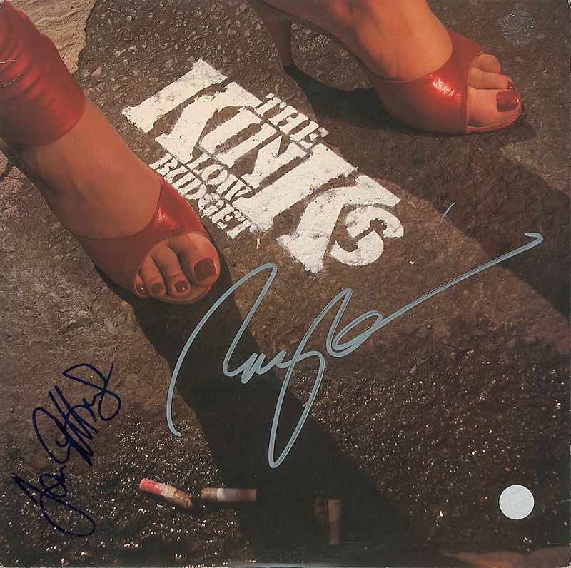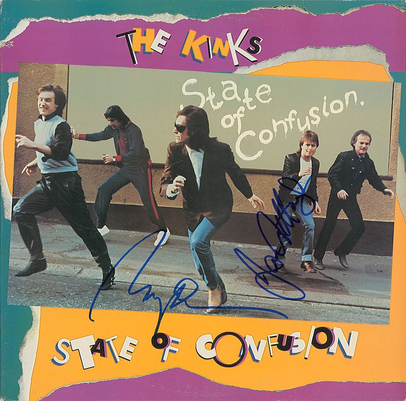 Two albums, State of Confusion and Low Budget, each signed on the front cover in ink or felt tip by Ray Davies and Ian Gibbons. One of the albums is included. In fine condition, with small label and label remnant to one cover and a discount cut to the other.