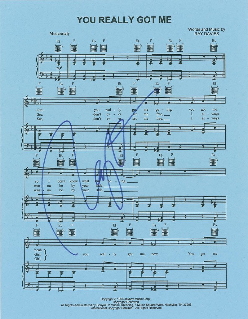First page of sheet music to ‘You Really Got Me,’ 8.5 x 11, signed in blue felt tip by Davies. In fine condition.