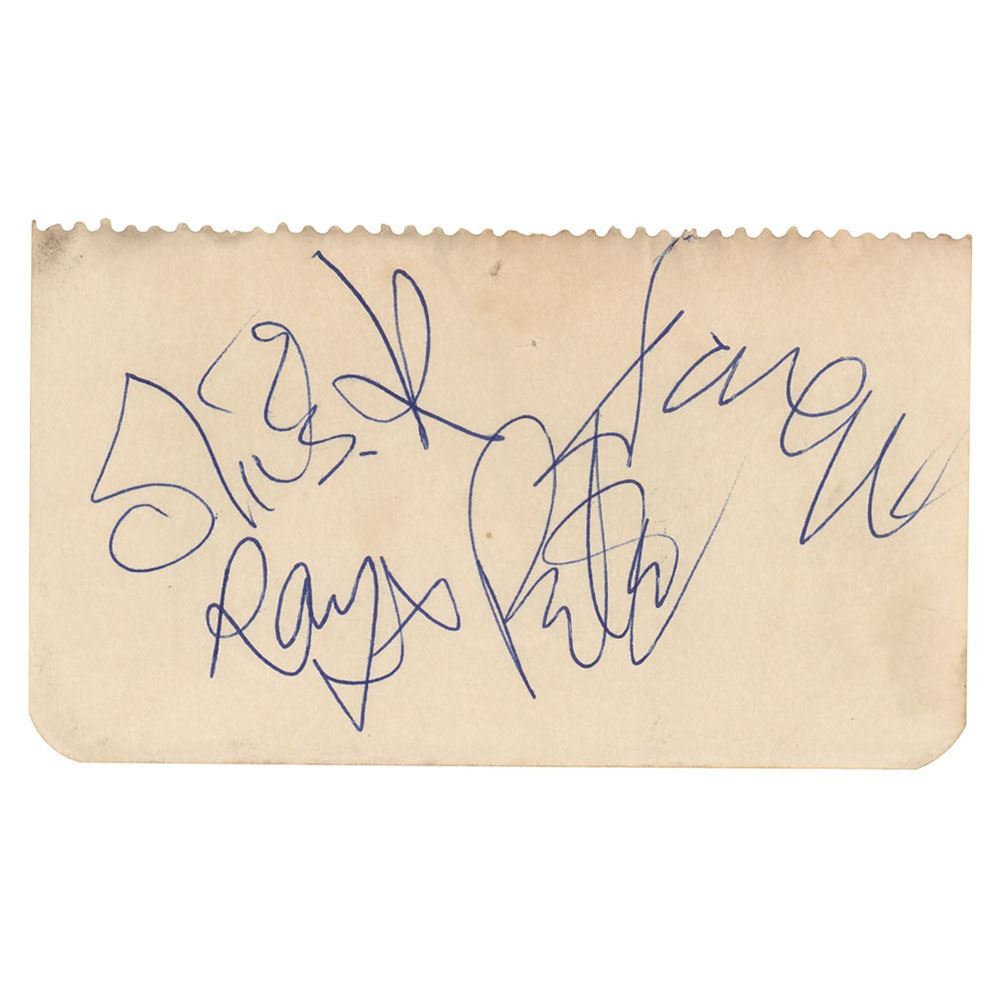 Ballpoint signatures of the Kinks—Pete Quaife, Dave Davies, Mick Avory, and Ray Davies—on an off-white 4.5 x 2.5 sheet. In very good to fine condition, with light soiling and overall creasing.