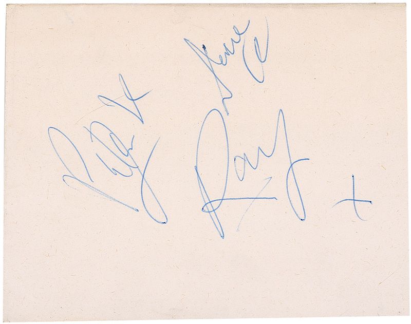 Vintage ballpoint signatures, “Ray,” “Dave,” and “Pete Quaife,” on an off-white sheet folded to a size of 5 x 4; and a vintage ballpoint signature “Mick Avory,” on a light pink 4 x 2.75 album page. In fine condition, with some mild toning and wrinkling to sheet. Accompanied by a certificate of authenticity from Tracks.