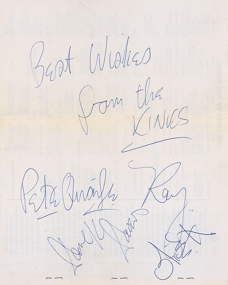 Vintage circa mid-1960s Swedish fan club booklet, two pages, 10 x 8, signed on the reverse in blue ballpoint by Ray Davies, Dave Davies, Pete Quaife, and Mick Avory. A few folds (signatures mostly unaffected), otherwise fine condition. Accompanied by a certificate of authenticity from Tracks.