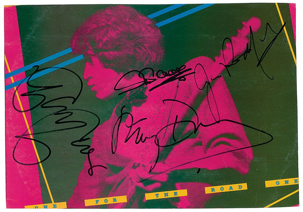 Album front cover for One for the Road, trimmed to a size of 11.75 x 8, signed in black felt tip by Ray Davies, Dave Davies, Jim Rodford, and Mick Avory. In fine condition, with a few scattered creases.