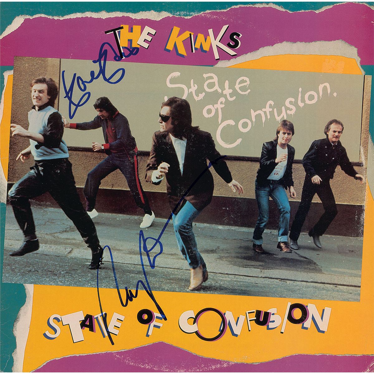 State of Confusion album signed on the front cover in blue felt tip by Ray Davies and Dave Davies. In fine condition, with a few dings and creases. The record is included.