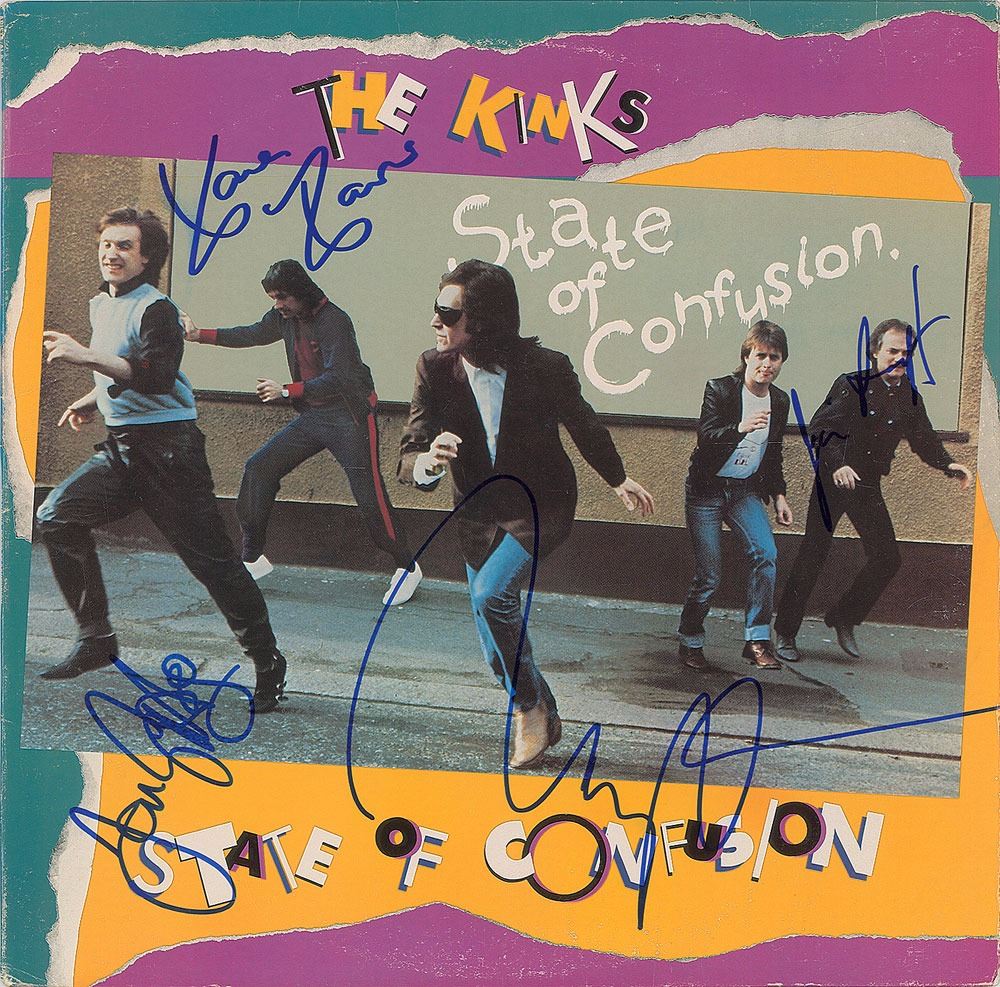 State of Confusion album signed on the front cover in blue felt tip Ray Davies, Dave Davies, Jim Rodford, and Ian Gibbons. In fine condition. The record is not included.
