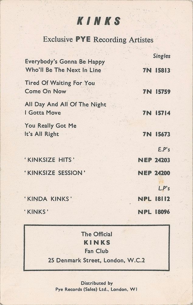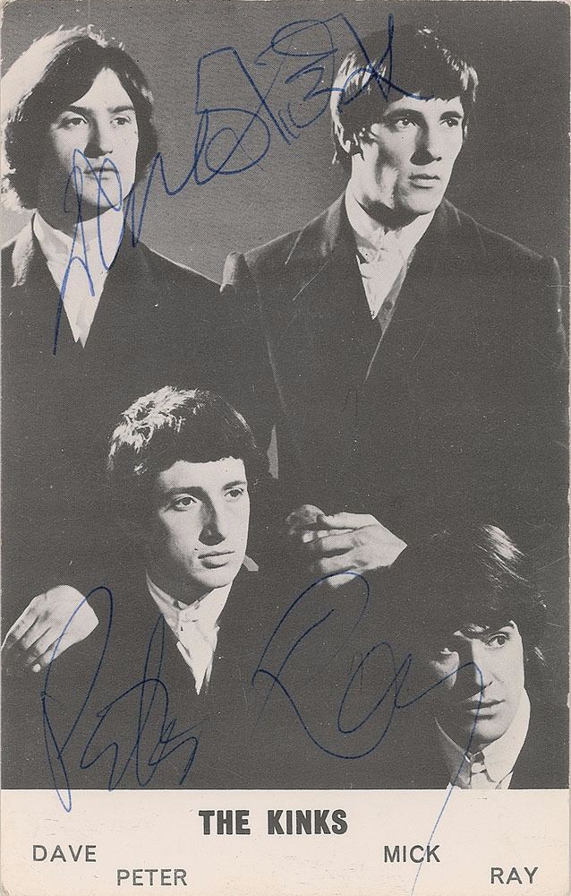 Desirable vintage circa 1960s Pye Records promo card, 3.5 x 5.5, signed on the front in blue ballpoint by Ray Davies, Dave Davies, Pete Quaife, and Mick Avory, all using their first name only. In fine condition. Accompanied by a certificate of authenticity from Tracks.