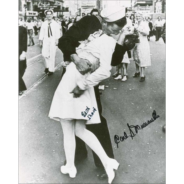 The most prominent of the several couples who claim to be the participants of the famous Eisenstaedt “Kiss” photo taken in Times Square on August 14, 1945, the day World War II came to an end. Glossy 8 x 10 photo signed in black felt tip by nurse Edith Shain and sailor Carl Muscarella. In fine condition. RRAuction COA.