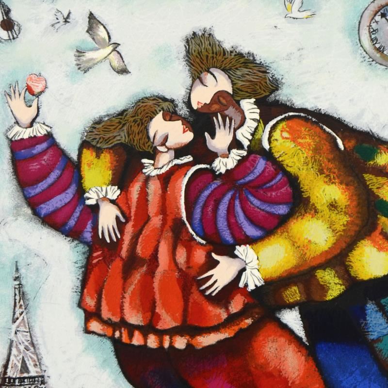 "The Kiss" is a limited edition serigraph on paper by Michael Kachan, numbered and hand signed by the artist. Includes a Letter of Authenticity. Measures approx. 25" x 30" (image).