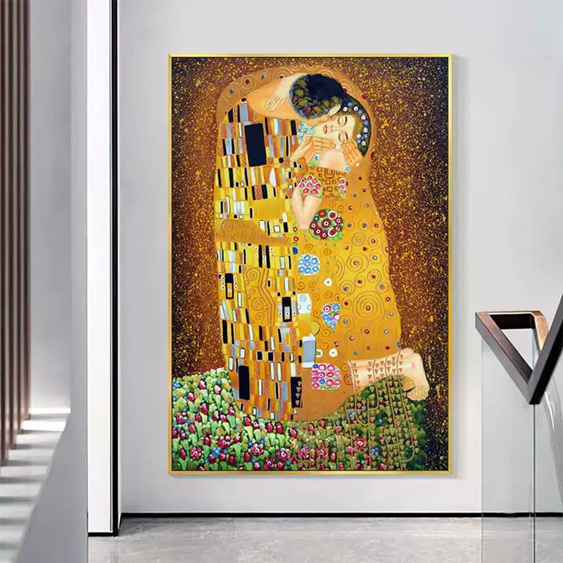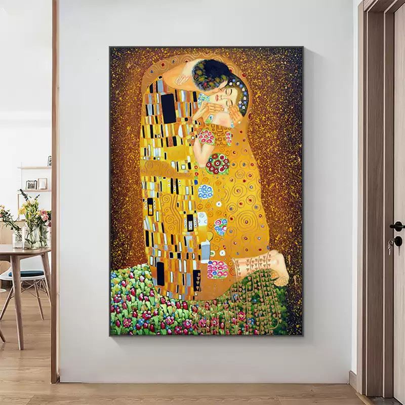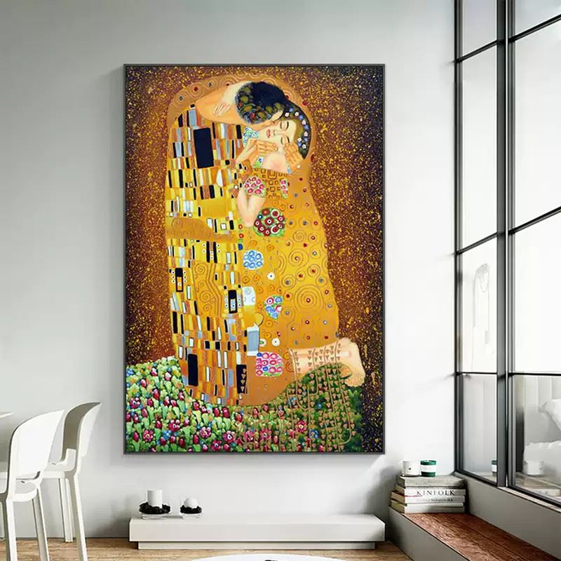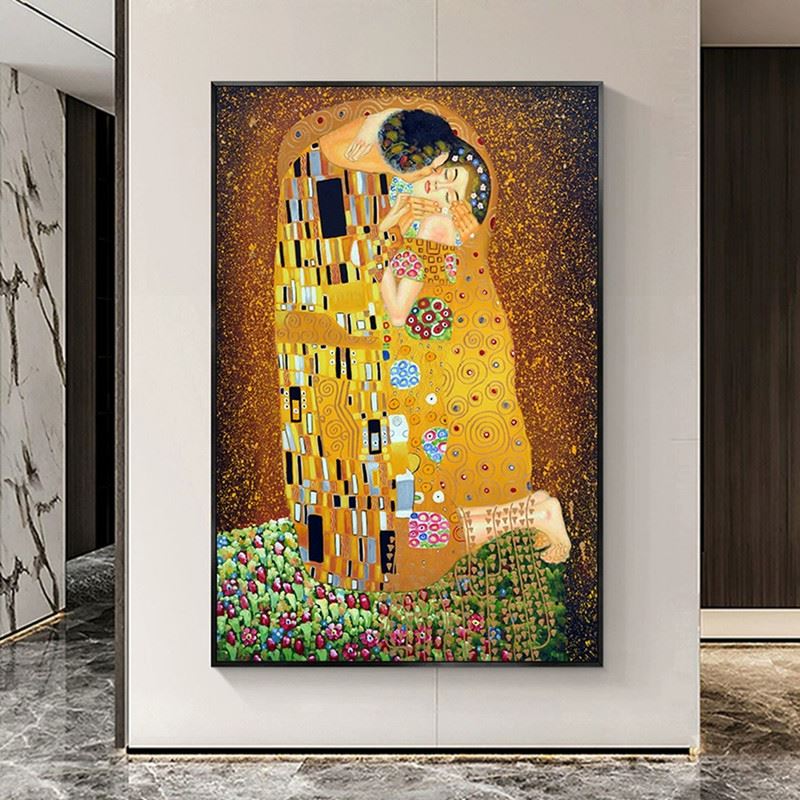 This iconic piece, inspired by Gustav Klimt's famous painting, encapsulates a moment of intimacy and passion. The figures are enveloped in a golden embrace, with intricate patterns and vibrant colors that enhance the sense of love and unity. The use of golden hues, floral details, and bold geometric forms creates a timeless, almost dreamlike quality. The image speaks of deep connection, where the blending of color and texture mirrors the emotional depth of the kiss. Dimensions: 24 x 31 inches.