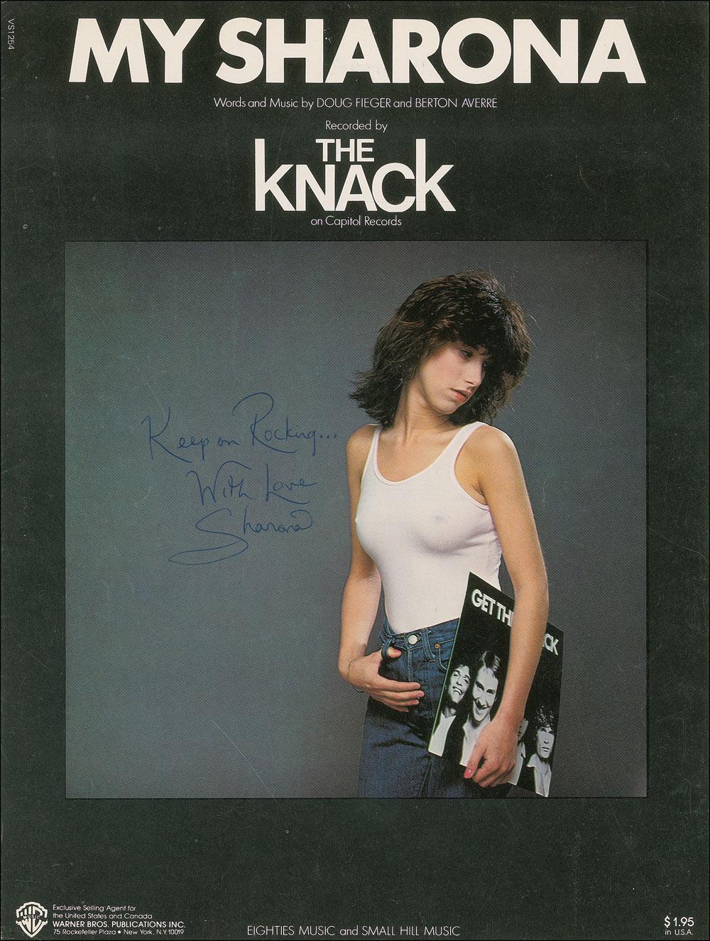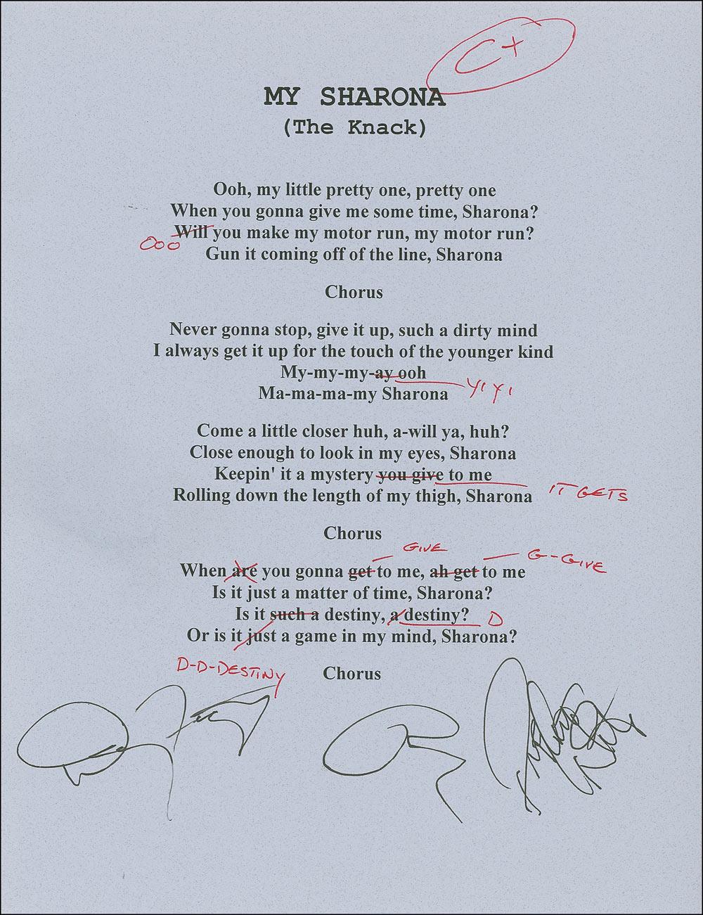 Two items: printed souvenir lyrics to ‘My Sharona,’ signed at the bottom by Doug Fieger, Berton Averre, and Prescott Niles, and also bearing handwritten corrections to the lyrics by Doug Fieger, giving the work a grade of a “C+”; and sheet music to ‘My Sharona,’ signed on the front cover in ballpoint, “Keep on Rocking… With love, Sharona.” In fine condition, with light creasing to sheet music.