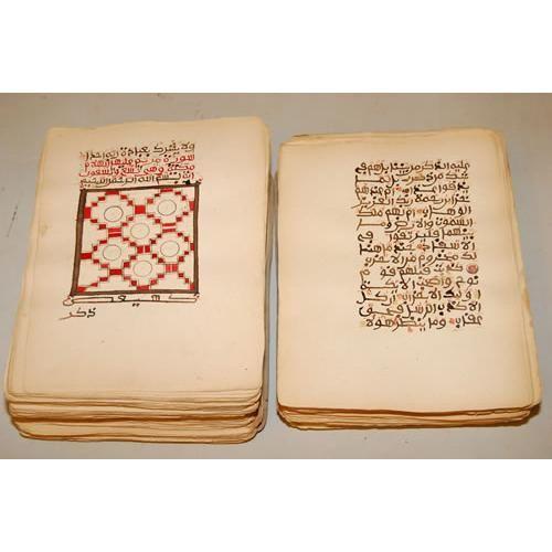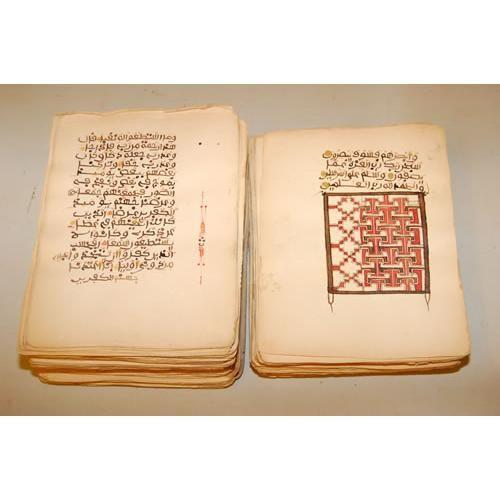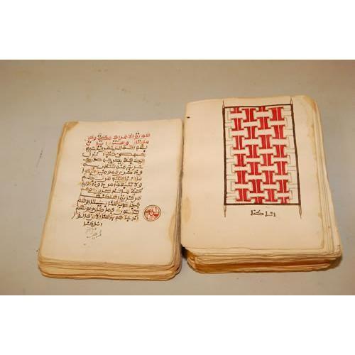 The Koran - Manuscript. 8vo - over 7¾" - 9¾" tall. Ex-Library. Good Condition. "This manuscript copy of the Koran was presented by the ex-Sultan Mormanda Mohammed III, ruler of Dikoa, Northern Cameroons, to Mr. Henry Gils, former war correspondent, now residing in Springfield (MA). Mr. Gils met this learned Moslem in 1917 after the fall of Morra Hills, in the Mandurra country in West Africa. He met him again in 1935 in French Somaliland. A Koran in the possession of a Christian while traveling through the desert country assures its bearer of aid and protection from the Moslem tribes. This copy was given Mr. Gils as a token of everlasting friendship". 601 handwritten leaves, Arabic script on versos and rectos, in red, black and yellow ink. 14 lines per page, with wide margins, on laid paper. Unbound as issued, with heavy cardboard covers. Includes a prayer on folded paper, meant to be worn on the body for protection. Unpaginated, uncollated, sold as is. Occasional damp mark on outer edge, not affecting the text.