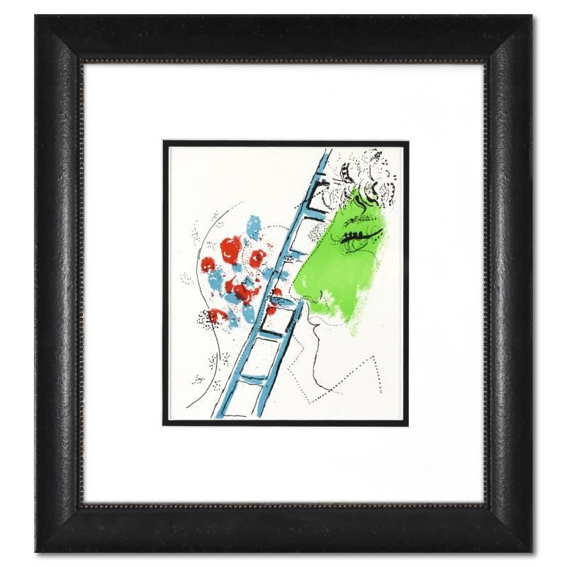 "The Ladder" is a lithograph on paper by Marc Chagall (1887-1985). This piece comes framed. Includes Letter of Authenticity. Measures approx. 16" x 17.5" (frame), 8" x 9" (image).