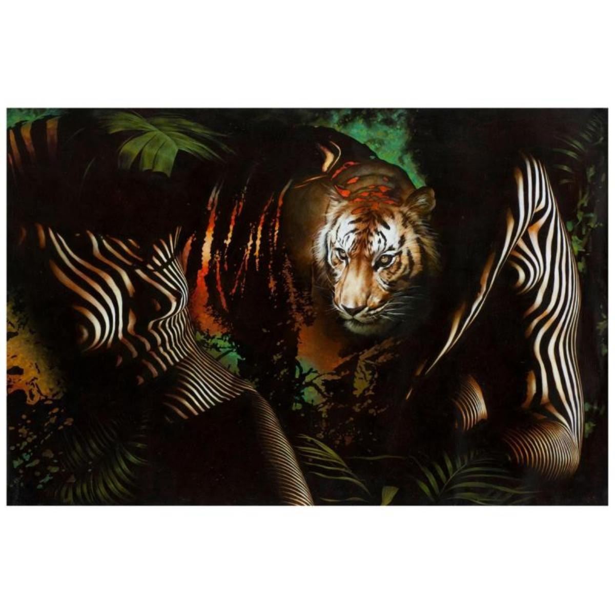 "The Ladies with the Tiger" is a limited edition Giclee on Canvas by Vera V. Goncharenko. The piece is numbered, hand siged by the artist, and come with a letter of authenticity. Measures approximately 24" x 36".