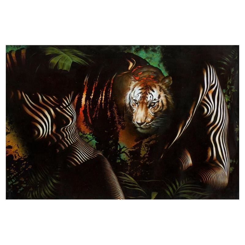 "The Ladies with the Tiger" is a limited edition Giclee on Canvas by Vera V. Goncharenko. The piece is numbered, hand signed by the artist, and come with a letter of authenticity. Measures approximately 24" x 36".