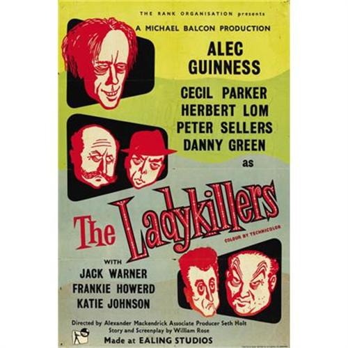 <B>The Ladykillers (Ealing, 1955).</B></I> British One Sheet (27" X 40"). For those who think that comedy in Great Britain began with Monty Python, think again. Beginning in the 1930s, England's Ealing Studios began to produce films, most notably comedies and documentaries. It was in the 1950s that the studio really hit its stride, however, when they embarked on a new kind of comedy, one that was deeply satirical and which poked fun at the institutions of British society. Best of all, the studio provided a sort of "training ground" for such soon-to-be illustrious actors as Alec Guinness, Peter Sellers, and Stanley Holloway, all of whom would become important actors and comedians in the years to come. "The Ladykillers," largely considered to be one of Ealings best productions, sees Alec Guinness and Peter Sellers heading a fine cast in a story about a gang of thieves who, through a series of misadventures, find that they must kill the little old lady who runs the boarding house in which Professor Marcus (Guinness) lives. Of course, this proves far more difficult than was at first thought, especially for the bumbling crooks. This rare UK one sheet shows pinholes, as well as light dirt and scuffing on the bottom half, a fold split at the center left border, some crossfold separation, and a corner fold in the bottom right. Additionally, there is some evidence of ghosting of printing in the top half from the lower half when folded. These are all fairly minor flaws, however, especially in light of the amazing rarity of this country of origin sheet. Fine+. <BR><BR><b>Shipping:</b> Flat Material, Small (<a target="_blank" href="http://www.heritageauctions.com/common/shipping.php">view shipping information</a>)