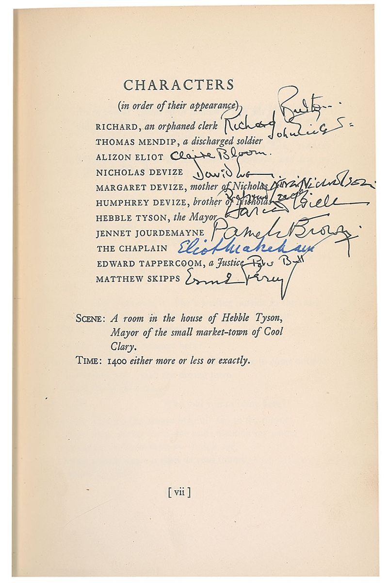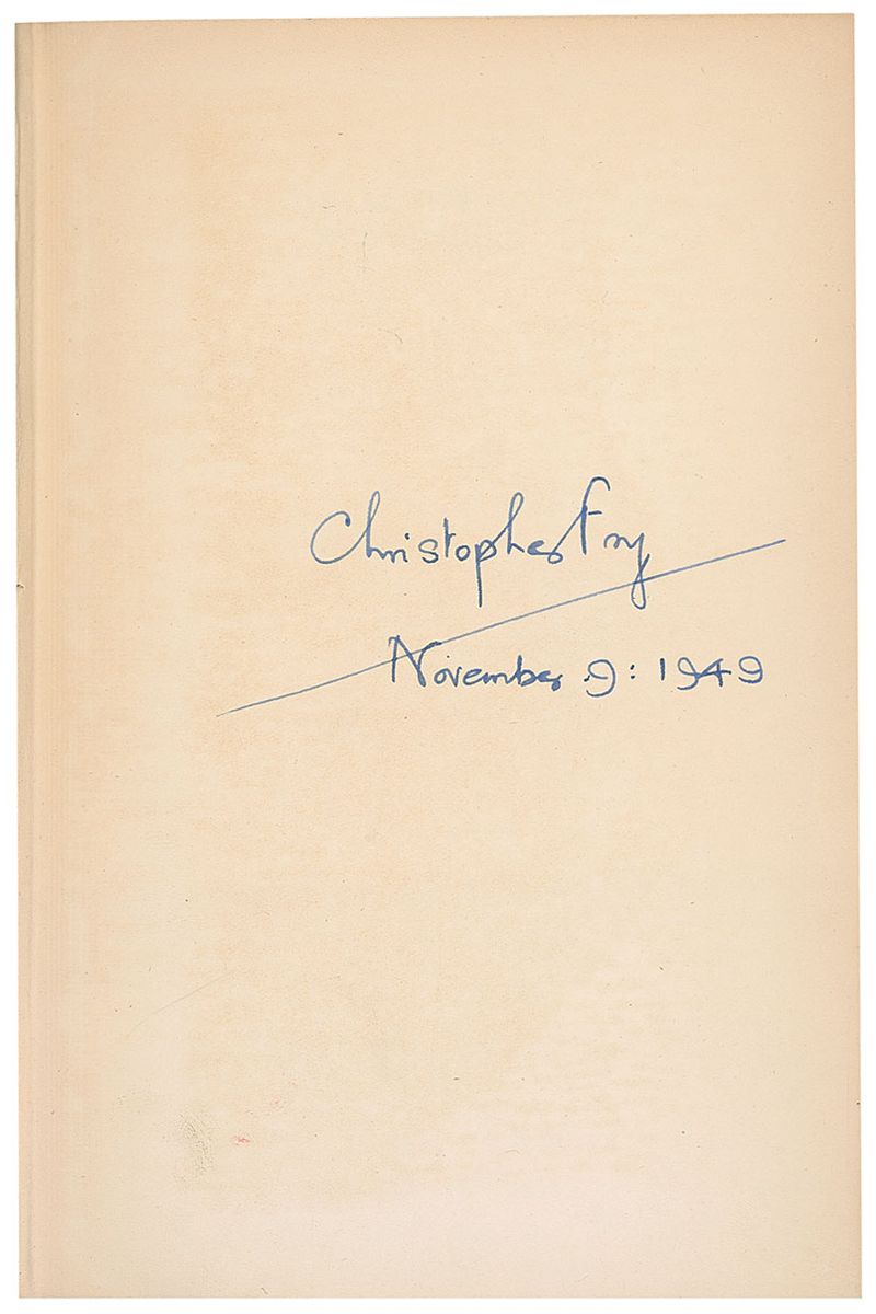 Signed book: The Lady’s Not For Burning. First edition, fourth impression. London: Oxford University Press, 1949. Hardcover, 5 x 7.5, 98 pages. Signed on the cast listing page in ink by all eleven original cast members: Richard Burton, John Gielgud, Claire Bloom, David Evans, Nora Nicholson, Richard Leech, Harcourt Williams, Pamela Brown, Eliot Makeham, Peter Bull, and Esme Percy. Also signed on the first free end page in fountain pen by the playwright, “Christopher Fry, November 9, 1949,” and bears a gift inscription in an unknown hand on the half-title page. In fine condition, with a small slice to the front cover near the spine.