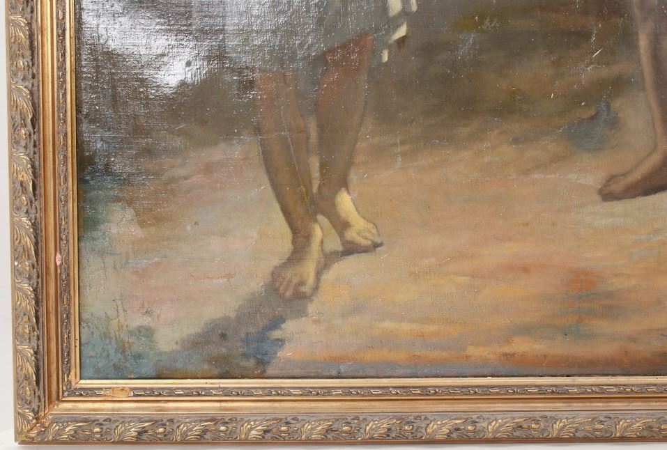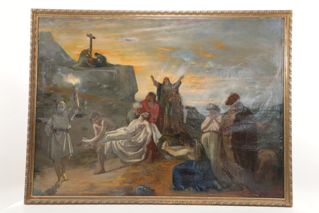Featured in this lot is an Original "The Lamentation Of Christ, A Study In Progress" attributed to Eugène Delacroix, circa 1852-1863; Provenance: Henry Sjaardema collection Big Sky, Montana. Delacroix, considered the greatest painter of the Romantic period, is probably best known for his painting “Liberty Leading the People.” He is far less known and appreciated as an important painter of religious subjects, yet with 120 pictures and over 220 drawings depicting traditional subjects, like The Pietà or Christ on the Cross, initiate the style of modern religious art. Although Delacroix (1798-1863) has been characterized as a radical and an unbeliever who found religion irrational, these pictures challenge claims that Delacroix’s religious subjects were few in number, mere commissions remote from his personal interests. Delacroix’s religious paintings were informed in general terms by the Romantic penchant for introspection that defined the aesthetic experience as a sign of the spiritual. In 1847, 1848, and again in 1857, Delacroix painted variations of The Lamentation. Delacroix’s early work is in marked contrast to his later versions which were created in a variety of media from the 1840s through the 1850s. The later pictures demonstrate a transformation from the solitary, strong, heroic figure to a more austere and vulnerable personality, posed in a stark and haunting vision of suffering as described in the Gospel of Mark. Delacroix continued to paint until the end of his life, but in his last years, perhaps as a result of personal reflection, he increasingly focused on Christian-themed works. This oil painting features the central figures of the Virgin Mary, arms outstretched, standing over the white-robed lifeless body of Christ being borne by three men. Next to Mary is a young boy, three adults are in the forefront right side while one man in the forefront left side is holding a torch in front of what appears to be the entrance to a cave. In the above left background, a cross is visible on a hill, three figures kneeling over a dead body. This painting was made over two strips of horizontal canvas. Appears unsigned but is titled and dated on an accompanying metal plaque. The painting has an ornate gold gilt wood frame. Craquelure observed, scuffing, and spotting observed on the reverse of the canvas. Visible art measures 92"L x 66.5"W with the frame measuring 97.5"L x 72.5"W x 2.5"D.*