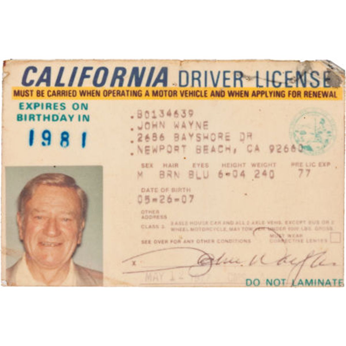 The Last Driver's License, 1977. Issued by the State of California on "May 12, 1977," depicting a color photograph of Wayne in the lower left corner next to his name and other standard statistics, noting an expiration date of "1981."2 1/4" x 3 1/2"