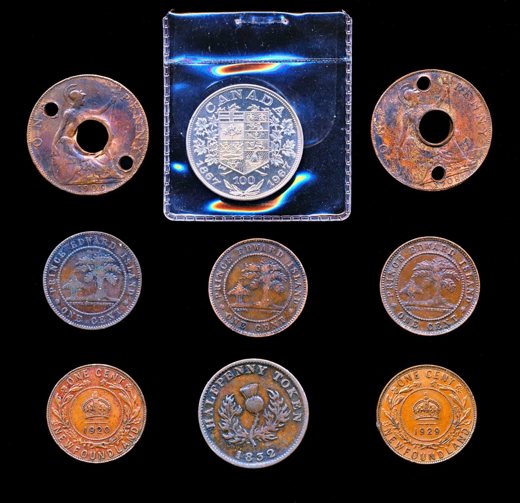 As usual, the last lot is made up of coins that hide on a writer's desk till the last possible moment. This lot has 3 x 1871 P.E.I. Large Cents VG-VF, 2 x Newfoundland 1 x 1920 Large Cent F+ and 1 x 1929 VF+, 1 x 1832 PNS-306 Br-871 8.31 gm. VF, 2 x Great Britain Edward VII Large Cents with three holes in each????? and 30 gram .999 McTavish 1967 Confederation Commemorative with an old auction ticket UNC.