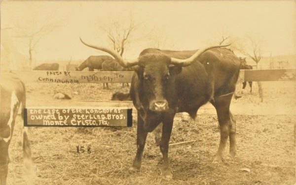 Longhorns owned by the Sterling Brothers Of Monte Cristo, Hidalgo County, TX. Circa 1914. 3-1/2" x 5-1/4".