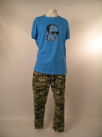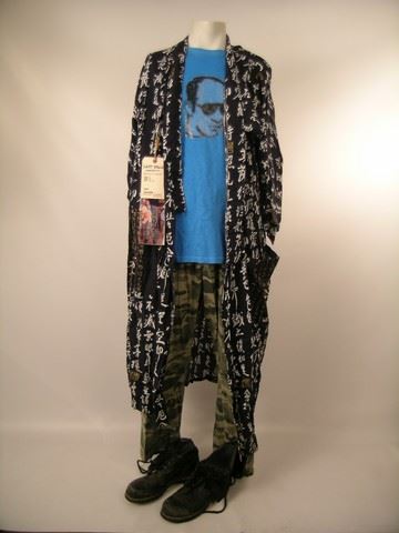 Lewis Dinkum (Johnny Knoxville) screen worn, hero, dark navy blue with Japanese writing long thin robe, light blue with head on the front 'American Eagle' t-shirt, green camouflage thin cotton pants, and black leather with yin yang sign on the side lace up the front boots. Includes wardrobe tag!