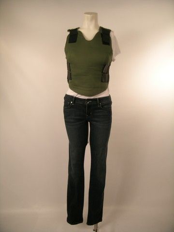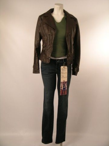 In his first film back (besides a few cameos'), "The Last Stand" (2013) tells the story of Arnold Schwarzenegger, playing a displaced big city police officer, who is now a sheriff of a one-dog town. One of his deputies is Sarah Torrance (Jaimie Alexander) who may be "small town" in heart, but shows major courage and loyalty. This is Sarah's screen worn, hero, brown leather 'Guess' jacket, olive green fake bullet proof vest, thin white cap sleeve 'Club Monaco' t-shirt, and medium/dark wash 'Level 99' stretch jeans. Includes the original production wardrobe tag.