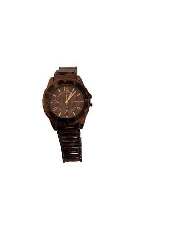 "Style & Co" female copper and black colored, stainless steel and metal watch. Likely used for the scene where Kaulder (Vin Diesel) is fixing watches at his desk.