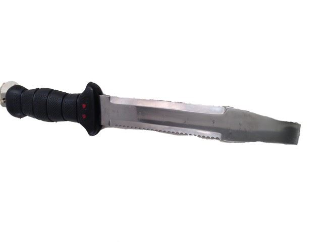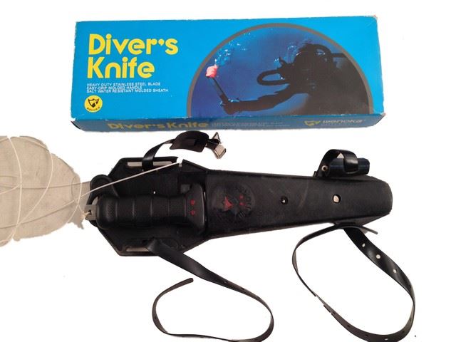 Diver's knife with stainless steel blade and a easy grip molded handle, salt water resistant molded sheath. The tip of the knife is flat and has numbers on the blade for measuring. Came from the set of production and was used in making of the film. (13x4)