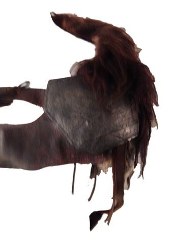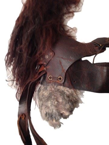 Screen worn, hero, Kaulder's (Vin Diesel) brown bison and rabbit fur cape medieval look, with leather straps and protective shoulder armor. Brown "Timberland" boots with velcro around the edges to keep shoes covers also included. Wardrobe tag included.