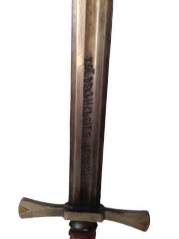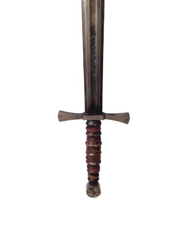 Kaulder's (Vin Diesel) screen used sword. Featured heavily in the movie. Sword is production constructed with a hardened rubber blade and wood handle. There is symbolic writng inscribed and a special symbol on the handle. 34x8)