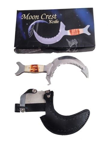 Moon crest knife with a smooth stone like handle that is cream and brown. This was used as a model for the prop makers in the film. The blade has a jagged edge around the inside, comes with the box and leather sheath and snaps shut , the blade also has a plastic tip protector.(10x4)