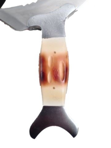 Screen used, stunt, resin moon crest knife with a smooth stone like handle that is cream and brown, the blade has a jagged edge around the inside, comes with a leather sheath and snaps shut.(10x4)