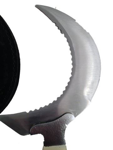 Screen used, stunt, resin moon crest knife with a smooth stone like handle that is cream and brown, the blade has a jagged edge around the inside, comes with a leather sheath and snaps shut.(10x4)