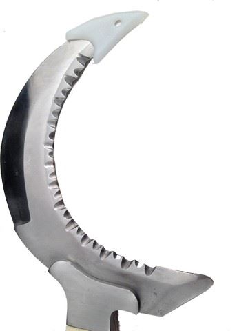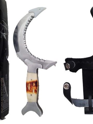 Screen used, hero, metal moon crest knife with a smooth stone like handle that is cream and brown, the blade has a jagged edge around the inside, comes with the box and leather sheath and snaps shut , the blade also has a plastic tip protector.(10x4)