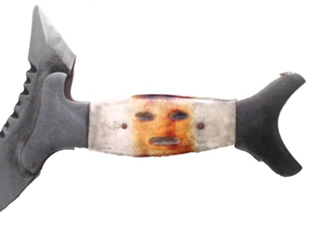 Screen used, metal moon crest knife with a smooth stone like handle that is cream and brown, the blade has a jagged edge around the inside.(10x4)