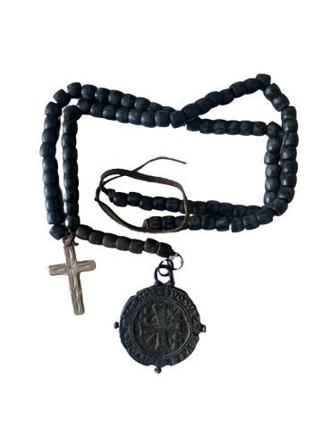 screen worn rosary necklace with wooden beads, a custom made medallion and a cross pendant.