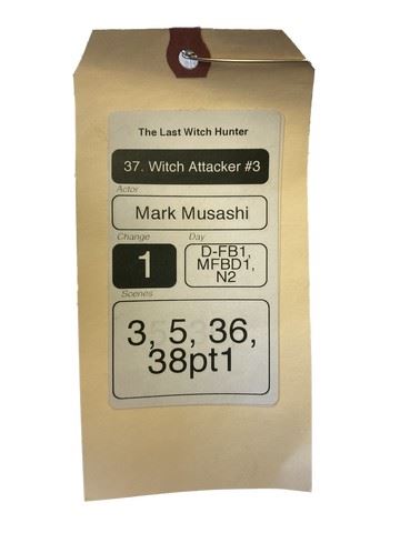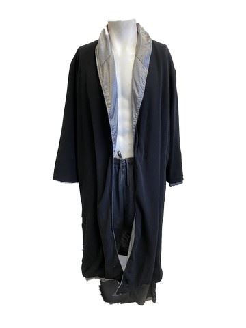 Witch Attacker #3 (Mark Musashi) screen worn, black/white diamond pattern silk and black cotton robe with pockets and collar, silk appears on the inside. "Champion" charcoal pants (size XL). "Sorel" grey, fur lined, slide on slippers (size 11).