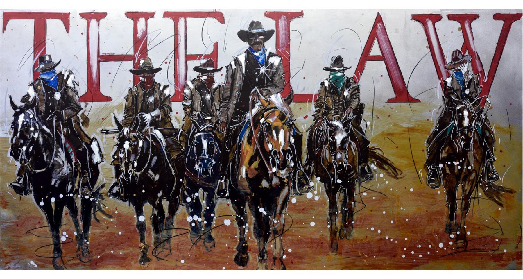 Whatever side of the Law you are on, you'll find "The Law" is Michael Bryan's brilliant & entertaining tribute to the Western movies he loved growing up. This power-packed 20x40" handworked giclee on canvas is numbered 1/1 Unique.