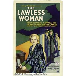 <B>The Lawless Woman (Chesterfield Motion Pictures Corporation, 1931)</B></I> One Sheet (27" X 41"). Gangster Ed Baker has been shot in self-defense by his showgirl moll, June Page. To make matters worse, she's hiding a reporter in her apartment. Between keeping an eye out for the cops, and keeping the gangsters from finding her secret, June has her hands full. Starring Vera Reynolds, Carroll Nye and Wheeler Oakman. Pinholes, edge wear with small tears, fold wear with separation and small paper loss, slight edge toning and soiling. Beautiful stone lithograph artwork featuring Reynolds and three tough guys. Fine.