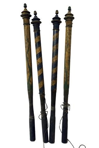 This collection of small bollards were dressed in the canals in the city of Venice miniature and used to tied up the Gondolas. A combination of a hand weathered wood piling caped with a cast resin finial. Each piece is meticulously hand painted with a mix of yellow, blue and green patterns. Fabricated from wood and resin. 30" long x 2.5" wide. 1:5 scale. This is from the celebrated collection of Academy Award winning New Deal Studios. New Deal Studios is a 21st Century Media Studio, unlike any in the world. A full-service film production and visual effects studio, with over 20 years of iconic imagery, New Deal Studios develops, designs, prototypes, and creates all types of high caliber media projects. Founded in 1995 by Matthew Gratzner, Ian Hunter and Shannon Blake Gans, this artist owned and operated independent studio, born in the heyday of visual effects, has truly evolved into the technology driven studio for the future, consistently delivering the perfect marriage of artistry and technology. Award winning credits by New Deal Studios include high-profile projects such as Dark Knight Rises, Hugo, The Avengers, Oz the Great and Powerful, Iron Man, The Dark Knight, Watchmen, I am Legend, Night at the Museum, Whiteout, 2012, Alice in Wonderland, Inception, Battleship and Interstellar.